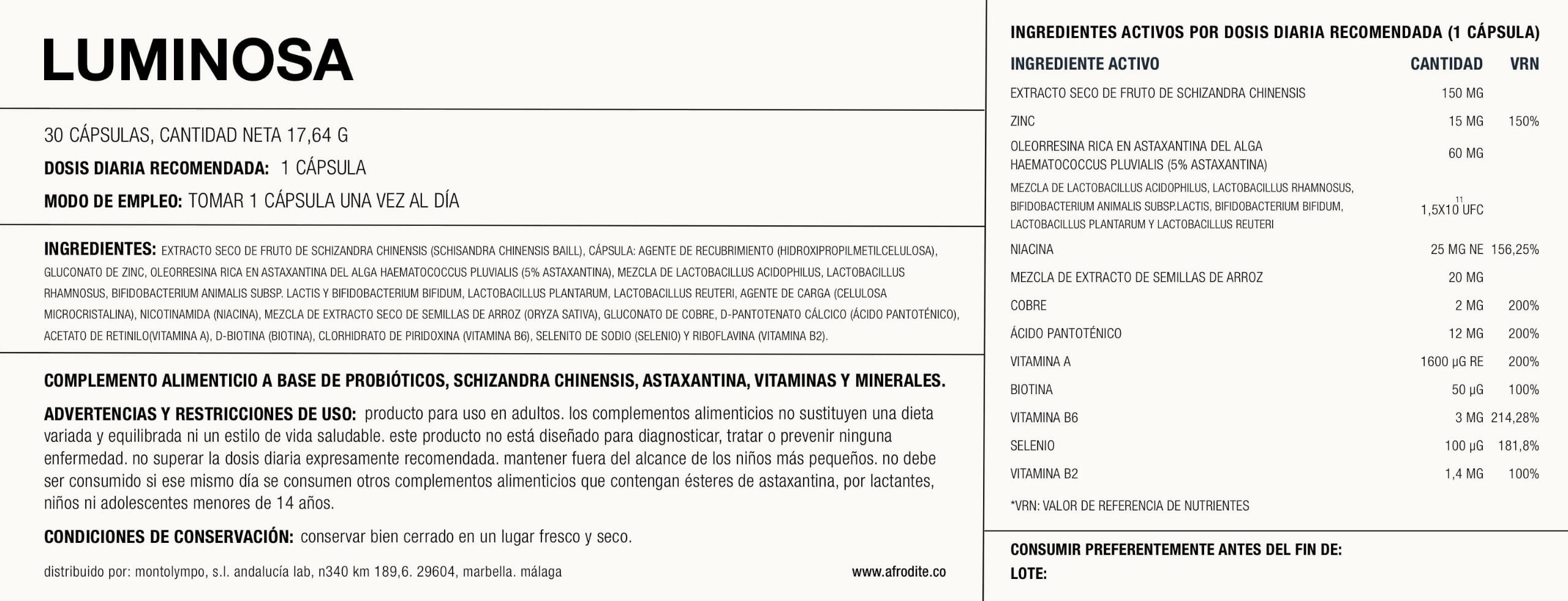 la dosis diaria recomendada son 1 cápsula al día de luminosa y 2 cápsulas al día de difuminada.tómalas con la comida, las 3 juntas.