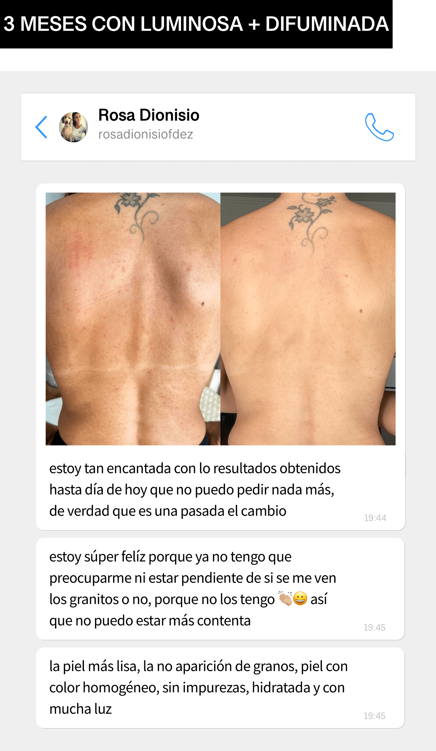 MANCHAS, LUMINOSIDADla piel está más clarita en general y me la veo más sanala hidratación de la piel, en general, piernas y brazos mucho mejor